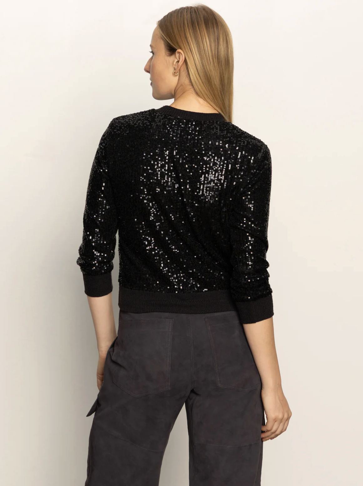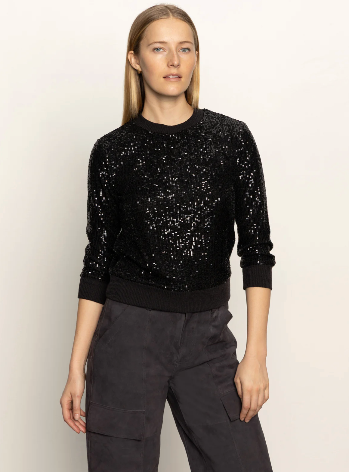 This top is a black sequin-embellished sweater that blends glamour with a cozy silhouette. It features a classic crew neckline and long sleeves, all finished with ribbed knit trim at the collar, cuffs, and hem for a snug fit. Fully covered in shimmering black sequins, the top adds a bold, eye-catching sparkle ideal for evening events or festive occasions.