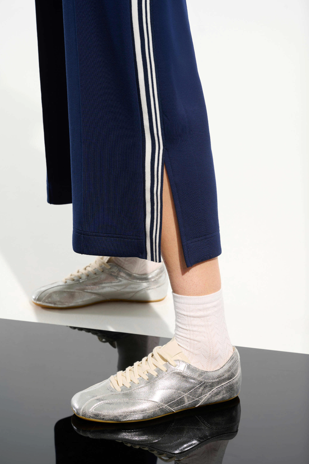 A sporty twist on a soft culotte shape, these scuba jersey pants feature side stripe rib trim and clean welt-style details. The elastic waistband with gentle shirring keeps the fit relaxed yet refined.