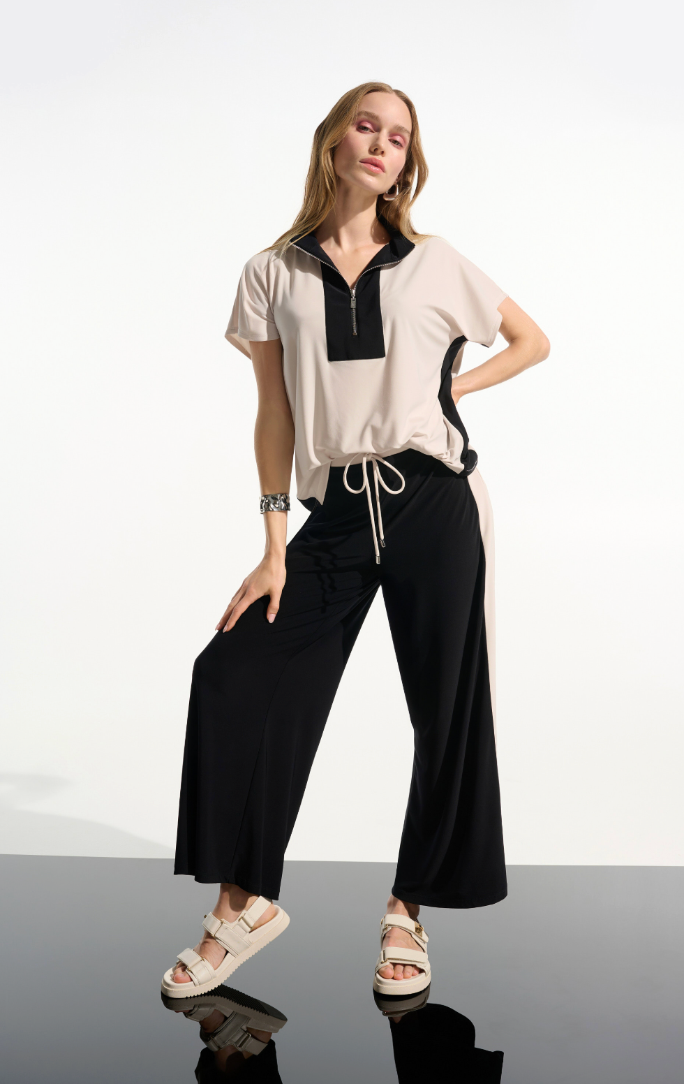 This silky knit top brings a sporty edge to clean lines, featuring a zipped stand collar and short dolman sleeves. The contrast collar and placket deliver a bold finish to the colour block design.